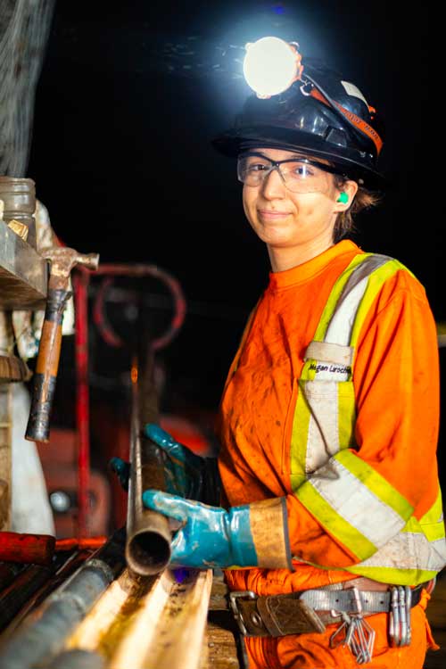 Je suis aide-foreur (Helper) pour l’entreprise Forage Rouillier. Après avoir fait quelques formations en esthétique après mon secondaire, j’ai réalisé que c’était un environnement trop calme et que j’avais besoin de travailler plus physiquement pour être bien. C’est pour cela que j’ai commencé mon cours à la fin de 2021 et obtenu mon diplôme au début de 2022, comme c’est une formation de 4 mois seulement. J’ai tout de suite été engagée par Forage Rouillier.